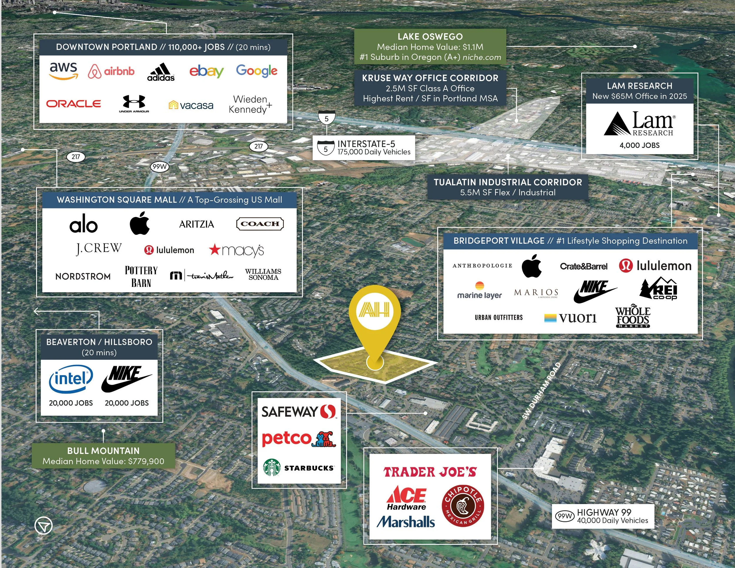 Residents benefit from convenient access to Nike, Intel, and OHSU, the three largest employers in the region, as well as two of the metro’s premier shopping destinations; Bridgeport Village and Washington Square Mall.